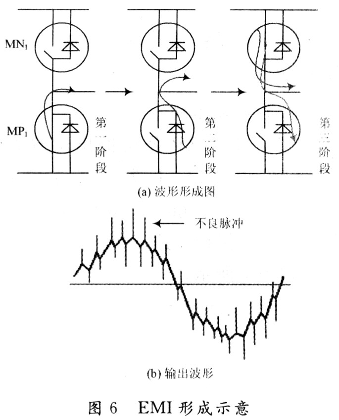 (1)輸出信號(hào)中將產(chǎn)生毛刺,造成電磁干擾,也即死區(qū)時(shí)間內(nèi),IN1/IN3都關(guān)斷。完全失控的輸出電壓將受到圖6(a)中體二極管電流的影響(體二極管電流的形成,參見下文EMI節(jié)),輸出波形中將出現(xiàn)毛刺干擾。
