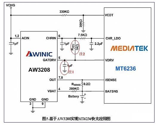 上海艾為電子專門針對(duì)MT6235/36平臺(tái)推出的AW3208在增加OVP功能的同時(shí),提供了智能充電功能,以滿足快速充電的功能。如圖2所示,AW3208內(nèi)置專有的K-ChargeTM技術(shù),可根據(jù)芯片溫度智能調(diào)整輸出電流,以保證在充電期間整個(gè)充電系統(tǒng)的安全。使得手機(jī)在實(shí)現(xiàn)快速充電的時(shí)候不會(huì)因?yàn)橛捎诃h(huán)境溫度較高或者充電電流過大導(dǎo)致芯片進(jìn)入過溫保護(hù)使得充電沒法正常進(jìn)行。圖3為在MT6235上的典型應(yīng)用圖。