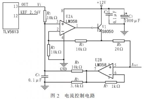 電流控制電路采用數(shù)模轉(zhuǎn)換器芯片TLV5613加上V/I轉(zhuǎn)換電路構(gòu)成穩(wěn)定電流源,可通過單片機程序控制輸出所需要的電流給測量回路供電以滿足系統(tǒng)測試對電流的要求。在極性測試環(huán)節(jié)可給出合適的電流值,便于系統(tǒng)測量二極管電壓值并據(jù)此判斷二極管的好壞及極性;在特性測試環(huán)節(jié)可根據(jù)設(shè)定電流值增大或減小回路電流,使其與設(shè)定值一致;在伏安特性曲線繪制環(huán)節(jié)可給出由小到大逐漸增大的電流值便于系統(tǒng)采樣繪圖。