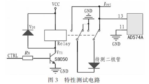 特性測試電路如圖3所示,圖中左側(cè)為繼電器控制電路,當CTRL端為高電平時,三極管VT1導通,VCC通過VT1加載到繼電器5引腳,繼電器動作,被測二極管接入極性轉(zhuǎn)換,二極管極性匹配后,即可進行特性測試。