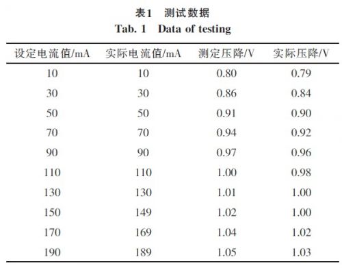 被測二極管采用1N4118,用2個優(yōu)利德數(shù)字萬用表UT33D作為測量儀器對系統(tǒng)進行測試,其中一個以毫安檔(量程200mA)與被測二極管串聯(lián),另一個以直流電壓檔(量程5V)與被測二極管并聯(lián),在不同的設(shè)定電流值下測量二極管的實際電流和電壓,測試結(jié)果如表1。