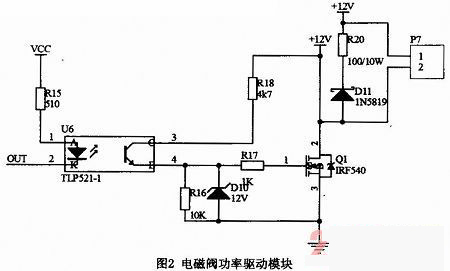圖2所示的是電磁閥功率驅(qū)動模塊。其中,P7插座連接高速電磁閥,電磁閥線圈一端連接電源,另一端連接場效應(yīng)管漏極。Q1是場效應(yīng)管IRF540,起放大作用。U6是可控制的光電耦合器件TLP521-1,它廣泛應(yīng)用于電路之間的信號傳輸,將ECU與負載隔離,可以增加電路的安全性,減小電路干擾,簡化電路設(shè)計。當(dāng)ECU發(fā)出驅(qū)動信號,光耦導(dǎo)通,穩(wěn)壓二極管D10將場效應(yīng)管Q1的柵極電壓穩(wěn)定在12V,漏極電流增大,漏極電壓被拉低。此時,電磁閥線圈電流增大,線圈產(chǎn)生強大的電動勢,電磁閥被打開。而當(dāng)光耦截止時,電磁閥關(guān)閉,線圈中電路變化很大,會產(chǎn)生反電動勢。R20功率電阻和D11肖特基二極管IN5819與電磁閥并聯(lián),防止場效應(yīng)管被擊穿。