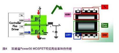 1.帶驅(qū)動(dòng)器和MOSFET的分立式解決方案現(xiàn)在仍在普遍使用。為滿足所有設(shè)計(jì)要求,現(xiàn)在飛兆半導(dǎo)體提供的采用小尺寸熱性能增強(qiáng)型MLP(QFN)封裝的產(chǎn)品,可獲得高系統(tǒng)性能。MOSFET實(shí)現(xiàn)了首先采用MLP封裝(見(jiàn)圖3所示)。其Power56和Power33產(chǎn)品系列采用最新的PowerTrench技術(shù),能夠同時(shí)提供超低RDSon和低Qg,從而適用于高開(kāi)關(guān)頻率應(yīng)用。鍵合技術(shù)可減小封裝的電感,提高封裝有限的ID,適用于大電流應(yīng)用。其低端FET產(chǎn)品組合采用SyncFET集成了肖特基二極管,在實(shí)現(xiàn)高開(kāi)關(guān)性能的同時(shí)降低了熱耗。