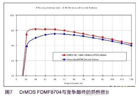 帶有Power56 MOSFET和SO-8驅(qū)動(dòng)器的分立式解決方案的板卡占位面積在120mm2左右,而MCM只需要64mm2或36mm2.后者模塊中的各個(gè)器件經(jīng)精心挑選并全面優(yōu)化,相比分立式解決方案其性能更高,熱性能也更好(圖6和圖7)。受電腦行業(yè)的推動(dòng),這種解決方案可使電流高達(dá)30A,并針對(duì)最高1MHz的開(kāi)關(guān)頻率優(yōu)化。甚至在大電流設(shè)計(jì)中即使考慮到熱設(shè)計(jì)規(guī)則,也無(wú)需散熱器,因系統(tǒng)中空氣流對(duì)于該芯片散熱是足夠的。