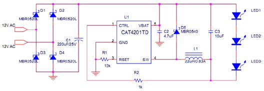 CAT4201采用降壓拓?fù)浣Y(jié)構(gòu),不要求輸入/輸出(I/O)電氣隔離,輸入電壓為12 Vac,輸出功率為2.7 W;其他規(guī)格包括:輸出電壓為9.1 V,額定輸入功率3.4 W,額定平均電流為300 mA,最大平均電流310 mA,最小平均電流295 mA,典型能效為83%。圖1是采用CAT4201的MR16燈電路。