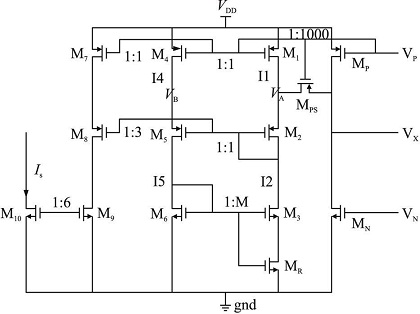 其中, VR = VGS3 - V GS4, 因此VGS的壓差決定了電阻上所形成的微電流, 即輸出電流I0 滿足的非線性關(guān)系為: