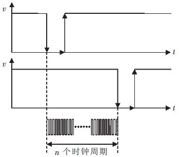 當(dāng)無(wú)運(yùn)動(dòng)物體遮擋光電開(kāi)關(guān)時(shí),光電開(kāi)關(guān)的接收端輸出高電平信號(hào),當(dāng)有物體經(jīng)過(guò)遮擋時(shí),光電開(kāi)關(guān)的接收端輸出低電平信號(hào)。即當(dāng)高速物體經(jīng)過(guò)一對(duì)光電開(kāi)關(guān)時(shí)會(huì)先后形成2 個(gè)高電平到低電平的脈沖信號(hào)。通過(guò)計(jì)時(shí)周期的方式測(cè)出這2 個(gè)下降沿之間的計(jì)數(shù)周期個(gè)數(shù)n,計(jì)時(shí)原理如圖1 所示。