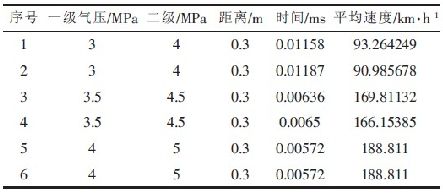 本測(cè)速系統(tǒng)已成功應(yīng)用在雙級(jí)空氣炮彈射物體測(cè)速實(shí)驗(yàn)中,實(shí)驗(yàn)數(shù)據(jù)如表1 所示。
