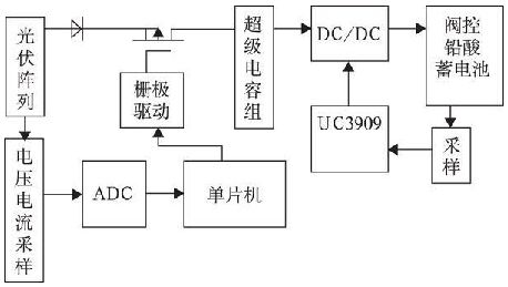 圖2 所示為基于U C3909 太陽能蓄電池充電器電路框圖, 光伏陣列經(jīng)過電壓電流采樣再經(jīng)模數(shù)轉換將數(shù)字信號反饋至單片機, 單片機根據(jù)光伏陣列的工作狀況輸出PWM 信號去驅動PMOS 管, 實現(xiàn)對光伏陣列的最大功率跟蹤。超級電容器組、DC/ DC 變換器、UC3909 用來實現(xiàn)對閥控鉛酸蓄電池的四階段充電控制, 并利用超級電容的特性優(yōu)化充放電過程。本文側重對超級電容器組、U C3909 及DC/ DC 變換器等部分實現(xiàn)對閥控鉛酸蓄電池四階段的充電分析及設計。