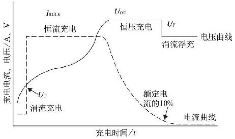 當蓄電池電壓低于充電使能電壓UT , 充電器提供很小的涓流IT 進行充電, IT 一般約為0. 01C( C 為蓄電池容量)