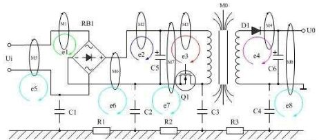 圖1是磁感應(yīng)產(chǎn)生傳導(dǎo)干擾的原理圖,圖1表示開關(guān)電源變壓器產(chǎn)生的漏磁通穿過其它電路時,在其它電路中也產(chǎn)生感應(yīng)電動勢,其中漏磁通M1、M2、M3產(chǎn)生的感應(yīng)電動勢e1、e2、e3屬于是差模干擾信號;M5、M6、M7、M8產(chǎn)生的感應(yīng)電動勢e5、e6、e7、e8屬于是共模干擾信號。