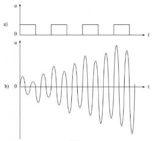 圖6是諧振回路產(chǎn)生諧振的工作原理圖。圖6-a)是一個含有諧波分量非常豐富的電壓方波,圖6-b)是LC串聯(lián)回路產(chǎn)生諧振時的電壓波形。當電壓方波作用于LC串聯(lián)回路時,方波的前后沿都會對LC串聯(lián)回路產(chǎn)生激勵(即接收能量),每次激勵過后又會產(chǎn)生阻尼振蕩(即損耗能量),當輸入電壓波形的上升率dv/dt值大于諧振回路波形(正弦波)的上升率時,電路就會產(chǎn)生激勵;當輸入電壓波形的上升率dv/dt值小于諧振回路波形的上升率時,電路就會產(chǎn)生阻尼。