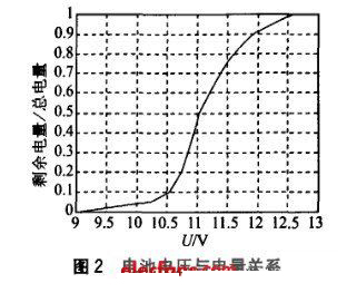 系統(tǒng)工作時間與電池電量成線性關(guān)系, 而電量與電池端電壓為非線性關(guān)系。圖2 所示為本系統(tǒng)所用電池在2 000 mA 恒流放電的情況下, 電池端電壓與電量的關(guān)系曲線, 其中橫軸為電池電壓, 縱軸為剩余電量相對于總電量的百分比。根據(jù)此曲線, 在MCU 軟件中擬合一個電壓與電量關(guān)系的數(shù)據(jù)表, 同時設(shè)置10 V為告警電壓; 系統(tǒng)可以實時查詢諸如電池電壓、電流、剩余電量、估計供電時間等信息, 并同時仿手機(jī)做成3段式顯示, 使上位機(jī)全面掌握電池狀態(tài),決定控制策略, 從而提高系統(tǒng)運行可靠性。MCU 軟件使用KeiluV2 軟件開發(fā), 上位機(jī)軟件使用LabWindow s 軟件開發(fā)。MCU 除完成電量查詢相關(guān)功能, 還要完成報警與顯示功能; 上位機(jī)軟件同時要完成環(huán)境參數(shù)的相關(guān)采集與處理。