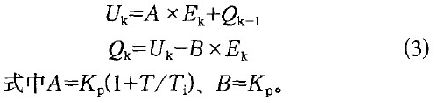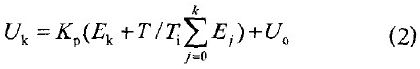 式中Uo-- 初始值;Uk - - 第k次采樣點(diǎn)獲得的控制量;Ek--第k次采樣點(diǎn)獲得的偏差量;Ej--第j次采樣點(diǎn)的偏差值;k一第k次采樣點(diǎn)。
