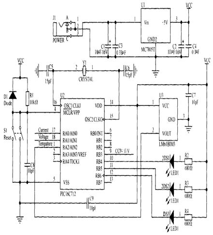 因此,設(shè)計(jì)良好的充電器應(yīng)具有溫度檢測(cè)功能并能夠根據(jù)不同的環(huán)境溫度調(diào)整充電過程中的各轉(zhuǎn)換電壓值;同時(shí),充電器還應(yīng)具備溫度保護(hù)功能,在充電過程中,當(dāng)蓄電池溫度超出限定的溫度范圍時(shí)充電器應(yīng)立即停止充電或進(jìn)入涓流充電,并且PIC16C712應(yīng)點(diǎn)亮故障指示燈以提示用戶出現(xiàn)何種異常。