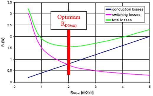 當(dāng)RDS(on)在1毫歐姆至3毫歐姆范圍內(nèi)時(shí),總功耗始終大致相同。但是,在1毫歐姆以下,RDS(on)僅下降0.5毫歐姆,便會令總功耗提高一倍,從而嚴(yán)重降低電源轉(zhuǎn)換器的效率。