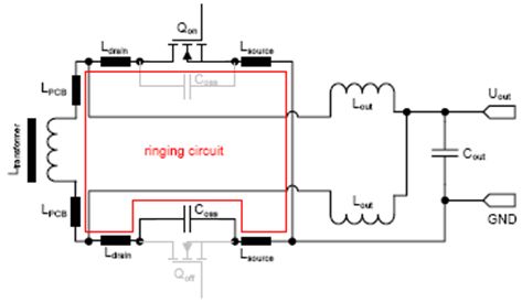 并且,環(huán)路的寄生電阻會抑制振蕩(Coss = MOSFET的輸出電容, Lstray = Lsource + Ldrain + LPCB + Ltransformer)。僅當(dāng)二次側(cè)的環(huán)路電感限制了電流換向時(shí),此處討論的波形形狀才有效。這就意味著,限制di/dt的不是一次側(cè)MOSFET的開啟速度,而是電源的二次側(cè)的雜散電感。