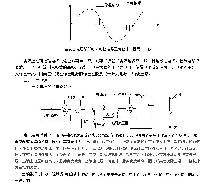 也就是~220V市電經(jīng)可控硅控制后只有一部分加在主變壓器的初級(jí)。當(dāng)輸出電壓Uo較高時(shí),可控硅導(dǎo)通角較大,大部分市電電壓被可控硅“放過(guò)來(lái)了”(如上圖所示),因而加在變壓器初級(jí)的電壓,即Ui較高,這當(dāng)然經(jīng)整流濾波后輸出電壓也就比較高了。