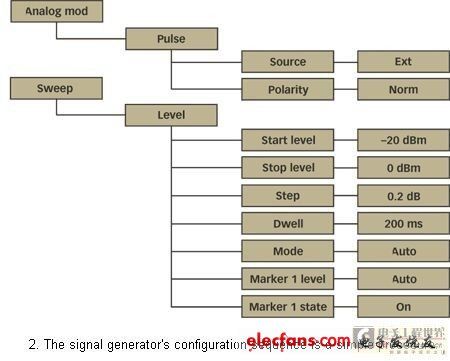 測試臺(圖1)使用一個與SMIQ RF信號發(fā)生器“脈沖”輸入相連接的脈沖發(fā)生器。為了在功率掃描模式中使用SMIQ,功率掃描必須與信號分析器中的時基掃描同步。幸好,當與二極管檢測器和類似XY模式濾波鏡的顯示器相關聯時,這一類信號發(fā)生器具有可以被用作純量網絡分析儀(SNA)的特性。在SMIQ的后部面板上,有幾個帶有功率掃描斜線以驅動濾波鏡的X軸的BNC連接器,以及校準顯示器X軸的標記。既然這樣,“標記”的輸出被當作信號分析器的觸發(fā)信號來使用。