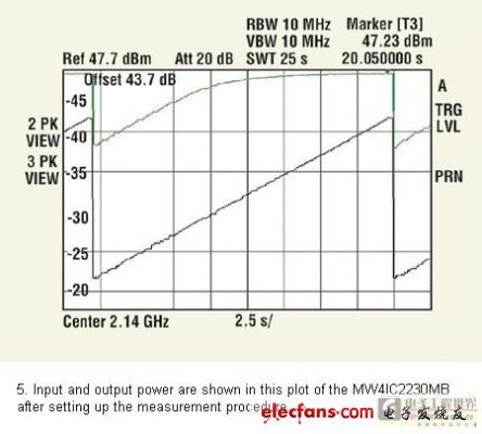 用于頻譜分析器的功能序列顯示在圖4中。此刻,頻譜分析器連接到輸入,且輸入功率在第二條線跡(線跡2)獲取,并保持在“觀察”模式。圖5中的黑色線跡即得。當在輸出再連接分析器之后,從第三條線跡(線跡3)獲得輸出功率,同樣也保持在“觀察”模式。通過設置“輸出偏差”值的參數等級偏差,該值在校準階段被設為43.7dB,從“線跡3”可以直接讀取以dBm為單位的絕對輸出功率,圖5中的綠線即得。通過在鋸齒末端的平面區(qū)域安置標記,可以讀取如圖5 中綠線所示的飽和功率。MW4IC2230MB顯示+47.23dBm的飽和功率。