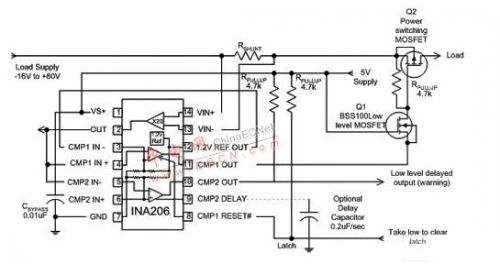 某些系統(tǒng)需要不止一個(gè)電流限制電平。舉例來說,系統(tǒng)以較低的電流限制作為故障即將發(fā)生的指示器,而以較高限制作為關(guān)閉系統(tǒng)的標(biāo)志。INA206-INA208 系列電流分路.采用兩個(gè)比較器來實(shí)現(xiàn)上述功能。某些系統(tǒng)會(huì)對(duì)較低限制采用延遲輸出,以避免超出最低限制后引起不必要地觸發(fā)瞬態(tài)偏移。圖 6 中的電路將 INA206 電流分路.部分的輸出反饋給兩個(gè)比較器,這會(huì)生成一個(gè)有效的低輸出警報(bào),并為關(guān)閉 MOSFET 緩沖路徑提供適當(dāng)極性。
