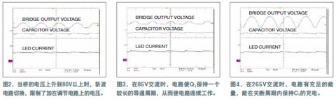 圖2顯示了在輸入電壓為150V 交流時(shí),不同周期部分的電壓。軌跡1是橋式整流電路的輸出。軌跡2是C1上的電壓,即斬波電路的輸出。軌跡3是電流檢測電阻上的電壓。這些軌跡清楚地表明,當(dāng)橋的輸出電壓增加到80V以上時(shí),斬波電路切換,限制了加在調(diào)節(jié)電路上的電壓。圖3顯示了輸入電壓為85V交流時(shí)的電壓。