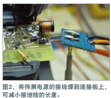 在測(cè)量電源軌的紋波時(shí),必須盡量減小噪聲,因?yàn)榧y波幅度可能很小。示波器探頭是基本的測(cè)量工具,但它們可能引入噪聲與誤差。地線(如與標(biāo)準(zhǔn)示波器探頭連接的那根線)可能增加一些不會(huì)出現(xiàn)在示波器軌跡上的電路噪聲。線路環(huán)就像一根天線,會(huì)提取周圍的雜散磁場。環(huán)路面積越大,提取的噪聲就越多。為證明這個(gè)理論,可將示波器地線連接到探頭尖端,然后到處移動(dòng)。示波器會(huì)隨著地線的移動(dòng)而顯示出噪聲的增減。用一個(gè)示波器探頭及其地線和插座可以做一個(gè)簡單的連接板(圖1)。