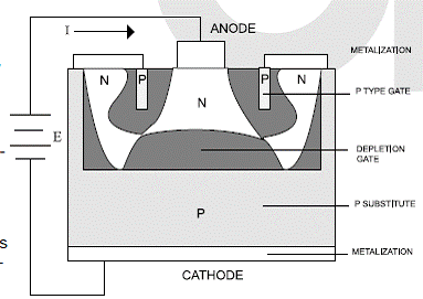 當(dāng)一個反向偏壓加到PN結(jié)的陰極和陽極時,這個恒流二極管開始導(dǎo)通,當(dāng)反向偏壓增加到VL時(見圖2),其電流由于N區(qū)的體電阻也跟著增加,當(dāng)電流增加到曲線的拐點(diǎn)時,在N區(qū)和P型柵之間形成一個耗盡層。這個耗盡層減小了N區(qū)中電流的路徑也就減慢了電流的增加速度。結(jié)果這個耗盡層遇到了P型柵于是就產(chǎn)生了夾斷效應(yīng),這使得電流變成恒定而幾乎和所加電壓無關(guān),直到所加電壓達(dá)到一個擊穿點(diǎn)Vb。如果所加電壓反過來,那么就相當(dāng)于一個正向電壓加到一個PN結(jié),其特性就和一個普通二極管加上正向電壓時一樣。
