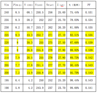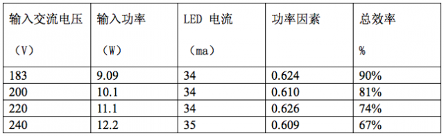 下面舉一個實(shí)測的結(jié)果為例,這是一個80顆3014串聯(lián)的球泡燈,采用了5顆Semitek 的S-562T并聯(lián)。它在不同的輸入市電電壓時,所測得的結(jié)果如下表所示。