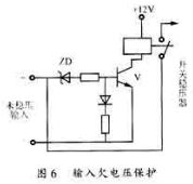 輸出電壓低于規(guī)定值時(shí),反映了輸入直流電源、開關(guān)穩(wěn)壓器內(nèi)部或者輸出負(fù)載發(fā)生了異常。輸入直流電源電壓下降到規(guī)定值之下時(shí),會(huì)導(dǎo)致開關(guān)穩(wěn)壓器的輸出電壓跌落,輸入電流增大,既危及開關(guān)三極管,也危及輸入電源。因此,要設(shè)欠電壓保護(hù)。簡(jiǎn)單的欠電壓保護(hù)如圖6所示。