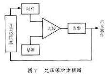 當(dāng)未穩(wěn)壓輸入的電壓值正常時(shí),穩(wěn)壓管ZD擊穿,晶體管V導(dǎo)通,繼電器動(dòng)作,觸點(diǎn)吸合,開關(guān)穩(wěn)壓器加電。當(dāng)輸入低于所允許的最低電壓值時(shí),穩(wěn)壓管ZD不通,V截止,觸點(diǎn)跳開,開關(guān)穩(wěn)壓器不能工作。開關(guān)穩(wěn)壓器內(nèi)部,由于控制電路失常或者開關(guān)三極管失效會(huì)使輸出電壓下降;負(fù)載發(fā)生短路也會(huì)使輸出電壓下降。特別在升壓型或反相升壓型的直流開關(guān)穩(wěn)壓器中欠電壓的保護(hù)是跟過電流保護(hù)緊密相關(guān)的,因而更加重要。實(shí)現(xiàn)方法是在開關(guān)穩(wěn)壓器的輸出端接電壓比較器,如圖7所示。