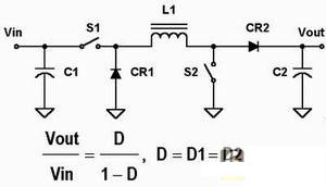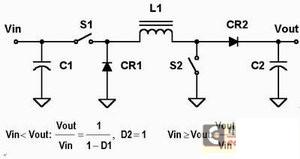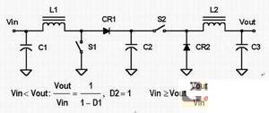 圖1a的電路盡管是四個(gè)電路中最復(fù)雜的,卻有幾個(gè)優(yōu)點(diǎn)。它的輸入和輸出電流被電感平滑處理,減小了輸入和輸出端的紋波電流以及對(duì)電容C1和C3的電流應(yīng)力。但是這一方案也有缺點(diǎn),電容C2的電流不管是當(dāng)Vin小于Vout時(shí)來自CR1還是當(dāng)Vin大于Vout來自S2,它都會(huì)有中斷,而且它需要兩個(gè)電感。