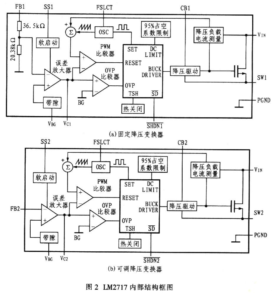 圖2所示為LM2717的內(nèi)部結(jié)構(gòu)框圖。該器件有專門的保護電路,正常工作時,該電路對LM2717具有保護功能。當器件溫度過高時,熱關(guān)閉電路會切斷電源。OVP比較器在電源啟動和關(guān)閉期間保護電源裝置,防止器件在最小輸入電壓下工作。OVP比較器被用來防止輸出電壓在沒有負載情況下上升,允許在滿載條件下的全脈寬調(diào)制(PWM)。當電源電流達到10μA時,該器件會使變換器工作在關(guān)閉模式。