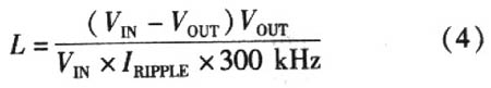 電感的關(guān)鍵參數(shù)是電感系數(shù)、峰值電流和直流阻抗。電感系數(shù)與電感波紋電流峰-峰值、輸入電壓以及輸出電壓有關(guān)(工作頻率是300kHz)。即: