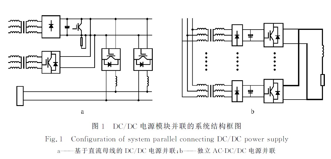 采用圖1a所示的拓撲結(jié)構(gòu),系統(tǒng)需大容量不可調(diào)直流電源,一般可采用整流變壓器降壓,二極管整流并經(jīng)電容濾波得到。這種結(jié)構(gòu)雖可保證并聯(lián)的每條支路有共同的直流電壓輸入,避免并聯(lián)支路因直流側(cè)輸入電壓不同而帶來的不均衡,但該直流電源的容量大,電流達20KA,直流母線承受的負荷過重,前級AC-DC設(shè)備要求較高,不易實現(xiàn)。另外,輸入端共用母線不利于實現(xiàn)完全意義上的獨立電源模塊的并聯(lián)。因此,采用如圖1b所示的AC-DC/DC直流電源并聯(lián)的拓撲結(jié)構(gòu)。