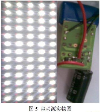 為了進一步驗證了基于恒流二極管的小功率LED 驅(qū)動電路的可行性。制作了驅(qū)動65 顆(5*15方式連接)0.06 W 白光LED 的驅(qū)動源,其中降壓電容C1 為1.5 μF,濾波電容C2 為1000 μF,恒流二極管為兩顆2DHL040 并聯(lián),并利用萬用表對電流電壓進行測量。實際測得輸入電壓在196~248 V范圍內(nèi)輸出電流恒定為80 mA,相當于流過每個LED 電流為 16 mA。在219 V 輸入電壓條件下,整個電路消耗的功率為 7.1 W ,則驅(qū)動源的功率因素為 0.47。圖5 為制作的小功率驅(qū)動源實物圖。