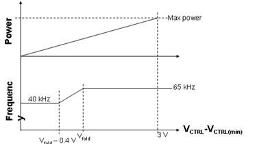 VCTRL與功率及頻率的關(guān)系:當(dāng)輸出功率下降時,VCTRL隨之下降;當(dāng)?shù)竭_反走設(shè)定點時,頻率線性下降;65 kHz版本將最小頻率內(nèi)部設(shè)定為40 kHz。