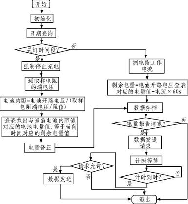 通過計算電流在時域上的積分,可得出電量變化值,在路燈工作前檢測到的電池電量作為初始電量,則剩余電量為初始電量減去電量變化值。同時通過對MPPT電路的輸出電流做積分,作為電量變化的校正值,從而得到較準確的剩余電量值。圖5為剩余電量計算流程圖。
