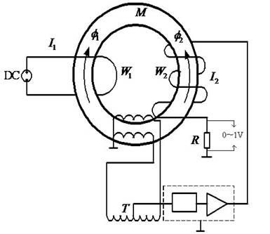 采用與以上信息相對應的傳感器和變換器對數(shù)據(jù)進行測量,溫度傳感器采用精密鉑電阻溫度傳感器PT100,該傳感器按照IEC751國際標準設計和制作,利用鉑電阻在溫度發(fā)生變化時其電阻值也發(fā)生變化的特性來測量溫度,傳感器元件由鉑絲燒制,穩(wěn)定性高,測量范圍廣,利用兩個溫度傳感器可以分別對光伏組件表面溫度和環(huán)境溫度進行測量,將被測溫度轉(zhuǎn)換成(4~20)mA DC二線制標準信號而遠程發(fā)送。電壓的測量采用四通牌ST-A系列的STCV-800電壓傳感器,該系列傳感器廣泛用于電力系統(tǒng)的監(jiān)測,電壓測試范圍分別為0~1200V.直流電流的測量選用武漢儀表公司生產(chǎn)的HD系列高精度直流大電流傳感器。其工作原理如圖2所示。
