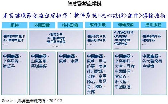 除智能電網之外,蘊藏1,200億元人民幣商機的智能醫(yī)療產業(yè),也是臺廠切入大陸物聯(lián)網市場另一個機會點。大陸“新醫(yī)改”將配合“健康中國2020”發(fā)展目標,以政策為導向推動改革規(guī)劃,十二五期間將投入8,500億元人民幣,循此戰(zhàn)略規(guī)劃全面提升中國大陸醫(yī)療水準。