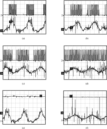 圖3(a)(b)(c)(d)示出了不同L、C參數(shù)時直流電源的控制脈沖和輸出電流。其中(a)為沒有LC濾波電路時的實驗波形,(b)的濾波參數(shù)為L=2mH、C=1100μF,(c)的濾波參數(shù)為L=2mH、C=2200μF,(d)的波波參數(shù)為L=2mH、C=3300μF。由圖可見,當逆變器輸入側不加LC濾波器時,直流電源輸出電流大范圍波動,造成控制脈沖時有時無。其結果是系統(tǒng)噪聲變大,整機效率下降,可靠性降低。隨著LC濾波參數(shù)的加大,逆變器輸入電流的波動逐漸減小,控制脈沖逐漸變得連續(xù),系統(tǒng)噪音變小,效率變高。為了保證逆變器輸入電壓的穩(wěn)定,濾波電感不宜加的太大,增大濾波參數(shù)適宜加大濾波電容。