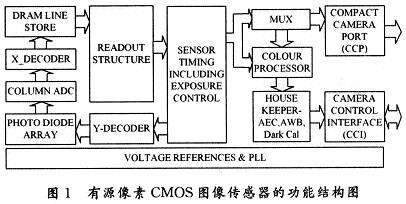 圖1示出了有源像素CMOS圖像傳感器(ActivePixel Sensor,APS)的功能結構圖,其中成像部分為光敏二極管陣列(Photo Diode Array)。