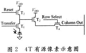 轉移管T1被用來將光敏二極管連接至源跟隨器T3,并通過復位管T2與VDD相連。T3的柵極與T1和T2之間的N+擴散區(qū)相連。與3T結構的APS相比,減少了與T3的柵極相關的漏電流效應。源跟隨器T3的作用是實現(xiàn)對信號的放大和緩沖,改善APS的噪聲問題。T4是用來將信號與列總線相連。其工作過程是:首先進入“復位狀態(tài)”,T2打開,對光敏二極管復位;然后進入“取樣狀態(tài)”,T2關閉,光照射到光敏二極管上產(chǎn)生光生載流子,并通過源跟隨器T3放大輸出;最后進入“讀出狀態(tài)”,這時行選通管T4打開,信號通過列總線輸出。