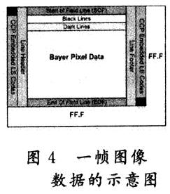 由APS陣列所獲得的圖像信息,經(jīng)過圖1中列模數(shù)轉換器(Column ADC)轉換為數(shù)字信號后,再經(jīng)過一系列的后續(xù)處理過程,得到輸出如圖4所示的幀圖像數(shù)據(jù)結構。