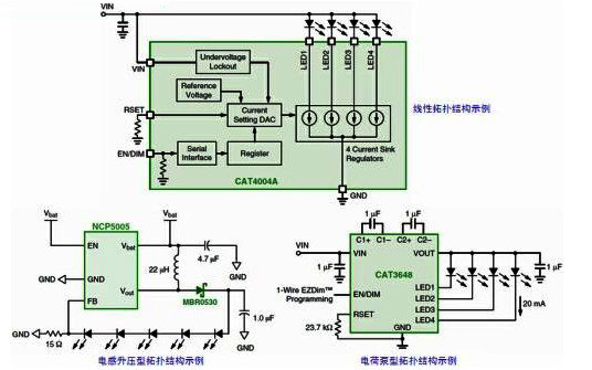 圖1: 低壓便攜設備應用的不同LED驅(qū)動器拓撲結(jié)構(gòu)示例