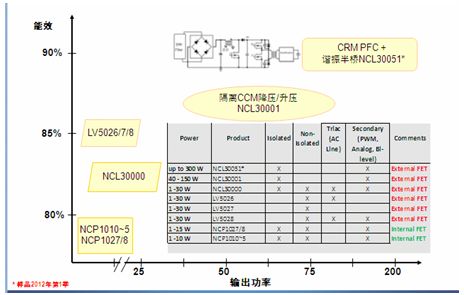 在安森美半導(dǎo)體用于LED照明的AC-DC電源方案中,1至10 W的照明應(yīng)用中推薦使用NCP1010~5,1至15 W可使用NCP1027/8,這些方案集成了MOS管,適用于隔離和非隔離應(yīng)用,支持次級(jí)PWM調(diào)光、模擬調(diào)光或雙亮度等級(jí)調(diào)光,能效高達(dá)75-80%;1至30 W的應(yīng)用可以使用LV5026、5027、5028,支持隔離方案,典型能效85%左右;1至40 W推薦使用NCL30000,可進(jìn)行初級(jí)可控硅調(diào)光,適用于隔離和非隔離方案,隔離方案能效80-85%。40至150 W推薦使用NCL30001,它是一個(gè)連續(xù)導(dǎo)電模式(CCM)控制芯片,隔離方案的典型能效85-90%;更大功率推薦使用NCL30051。圖2是這些方案輸出功率與能效的對(duì)比。以下將具體介紹這些方案的功能和特點(diǎn)。