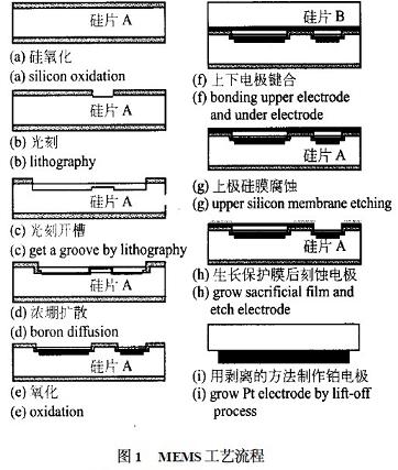 硅電容式壓力傳感器的敏感元件是半導(dǎo)體薄膜,它可以由單晶硅、多晶硅等利用半導(dǎo)體工藝制作而成。典型的電容式傳感器由上下電極、絕緣體和襯底構(gòu)成。當(dāng)薄膜受壓力作用時(shí),薄膜會(huì)發(fā)生一定的變形,因此,上下電極之間的距離發(fā)生一定的變化,從而使電容發(fā)生變化。但電容式壓力傳感器的電容與上下電極之間的距離的關(guān)系是非線性關(guān)系,因此,要用具有補(bǔ)償功能的測量電路對輸出電容進(jìn)行非線性補(bǔ)償。由于高溫壓力傳感器工作在高溫環(huán)境下,補(bǔ)償電路會(huì)受到環(huán)境溫度的影響,從而產(chǎn)生較大的誤差?;谀P妥R別的高溫壓力傳感器,正是為了避免補(bǔ)償電路在高溫環(huán)境下工作產(chǎn)生較大誤差而設(shè)計(jì)的,其設(shè)計(jì)方案是把傳感器件與放大電路分離,通過模型識別來得到所測環(huán)境的壓力。高溫工作區(qū)溫度可達(dá)350℃。傳感器件由鉑電阻和電容式壓力傳感器構(gòu)成。其MEMS工藝如下: