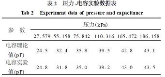 1可見,擬合的電容誤差小于1%。由此可見,在不同的時(shí)刻測得UO(t),通過曲線擬合得出參數(shù)RC。再給電路加小信號直流電源,測出R值,即求得C,通過C值則可知被測環(huán)境的壓力。圖5為350℃時(shí),不同的壓力所對應(yīng)的電容的理論值和實(shí)驗(yàn)值,從實(shí)驗(yàn)數(shù)據(jù)(表2)可得,在測壓的過程中,利用模型識別的方法,誤差較小,其測壓誤差小于2%。