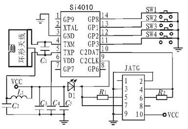 無線電發(fā)射系統(tǒng)是以Si4010 為核心來設(shè)計(jì)。Si4010 的4 個(gè)輸入輸出端口與按鍵直接相連,內(nèi)部電路可直接采集按鍵狀態(tài)信息。Si4010 的信號(hào)差分輸出端TXM、TXP 分別與環(huán)形天線的兩端連接,環(huán)形天線直接印制在PCB 板上,減少了發(fā)射系統(tǒng)體積。采用C2 接口編程,Si4010 的C2DATA、C2CLK 端口與JTAG 接口的4 個(gè)端口相連。C3、C4、C5組成電源濾波電路。發(fā)光二極管提供按鍵動(dòng)作指示,當(dāng)有按鍵按下時(shí),放光二極管亮,沒有按鍵按下,放光二極管滅。無線電發(fā)射系統(tǒng)的主要功能是在Si4010 內(nèi)部MCU的控制下采集按鍵電路的狀態(tài)信息, 實(shí)現(xiàn)數(shù)據(jù)加密和編碼,再進(jìn)行FSK 調(diào)制,調(diào)制后信號(hào)經(jīng)放大調(diào)諧,由環(huán)形天線發(fā)射出去。