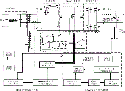 圖1示出了系統(tǒng)主電路和控制電路框圖。交流輸入電壓經(jīng)過共模抑制環(huán)節(jié)后,再經(jīng)工頻變壓器降壓,然后整流得到一個(gè)直流電壓,此電壓經(jīng)過Boost電路進(jìn)行升壓,在直流環(huán)上得到一個(gè)符合要求的直流電壓350V(50Hz/220V交流輸出時(shí))。DC/AC變換采用全橋變換電路。為保證系統(tǒng)可靠運(yùn)行,防止主電路對控制電路的干擾,采用主、控電路完全隔離的方法,即驅(qū)動(dòng)信號(hào)用光耦隔離,反饋信號(hào)用變壓器隔離,輔助電源用變壓器隔離。過流保護(hù)電路采用電流互感器作為電流檢測元件,其具有足夠快的響應(yīng)速度,能夠在MOS管允許的過流時(shí)間內(nèi)將其關(guān)斷。